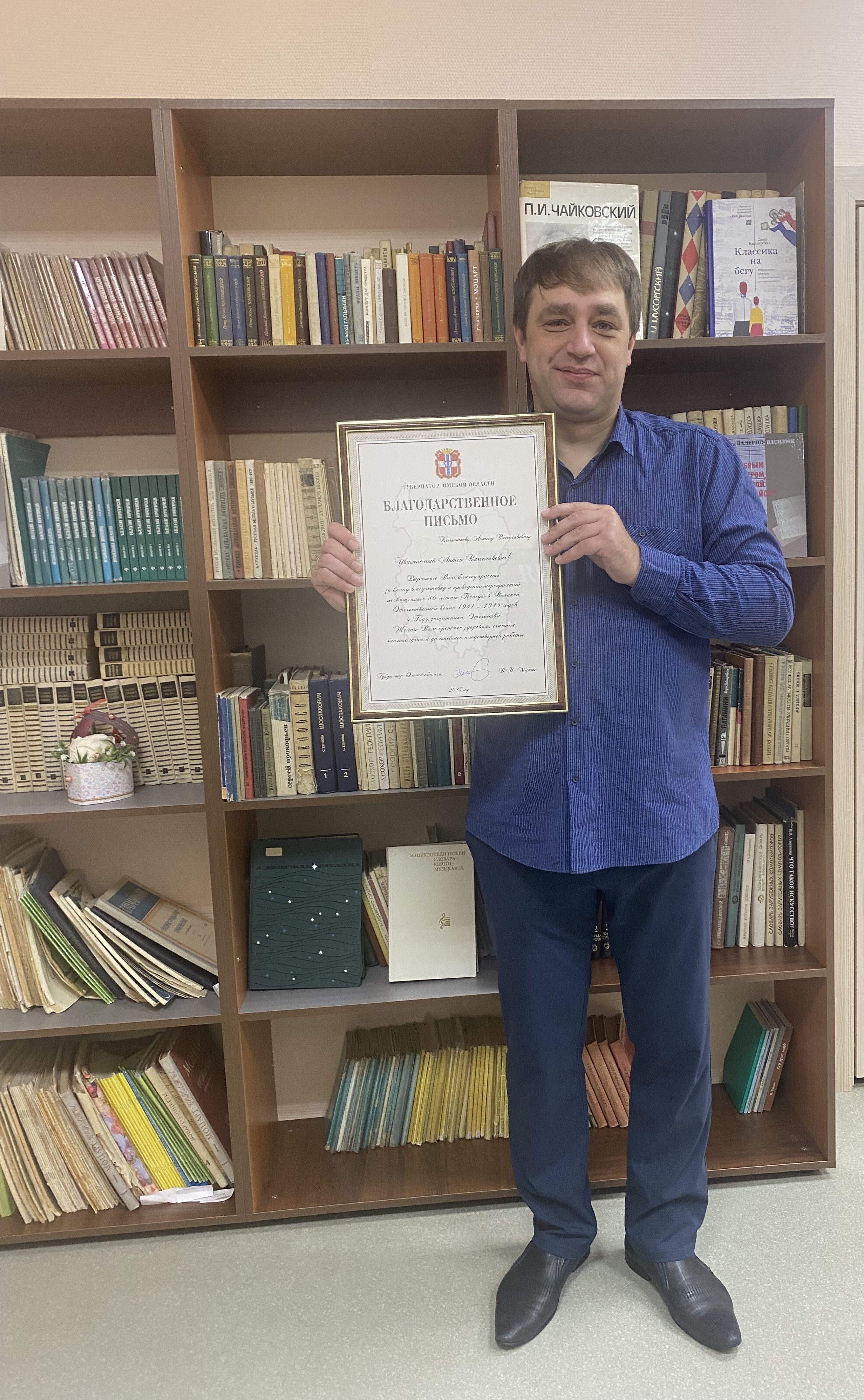 Благодарственное письмо губернатора Омской области Виталия Хоценко за вклад в подготовку и проведение мероприятий, посвященных 80-летию Победы в Великой Отечественной войне 1941-1945 годов «Году защитника Отечества», вручено преподавателю Исилькульской детской школы искусств Антону Вячеславовичу Большакову. |